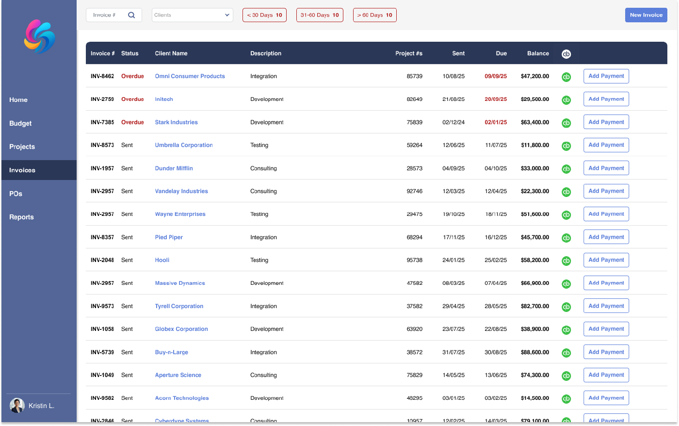Portfolio Manage invoices, track balances, and view due dates in one clear view. Add payments with a single click. 1 / 5
